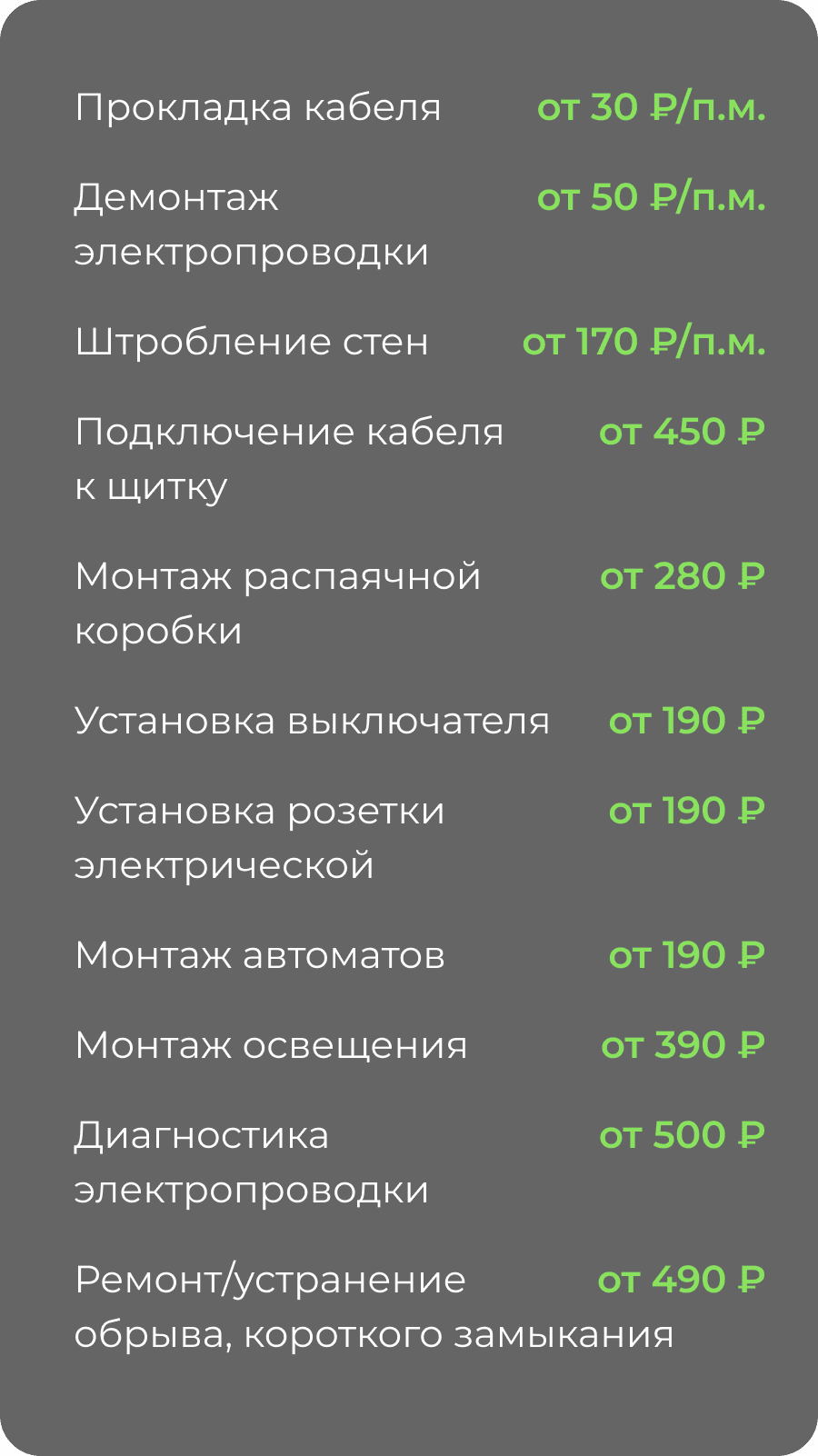 30 инженеров ежедневно трудятся на благо вашей электропроводки. Работаем как с аварийными случаями, так и с рядовыми ситуациями. Благодаря собственному отделу качества мы знаем, что вызываем доверие у клиентов. Достигли этого безупречным качеством выполнения заказа, быстрым реагированием на заявки, краткими срокам ремонта. При высоком уровне сервиса оставляем цены доступными.